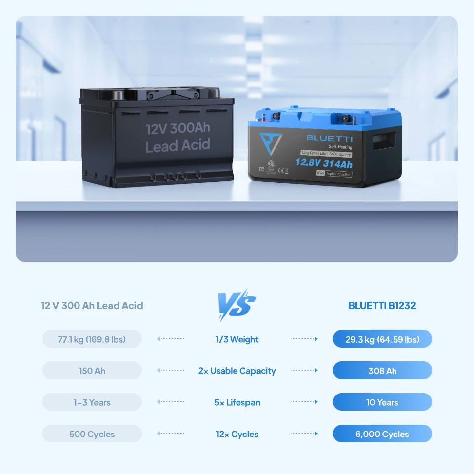 Say goodbye to bulky, short-lived lead-acid batteries. BLUETTI LiFePO₄ batteries are up to 70% lighter, charge faster, and last up to 10 times longer. Imagine more power for your devices, less hassle for you, and savings that add up over time.